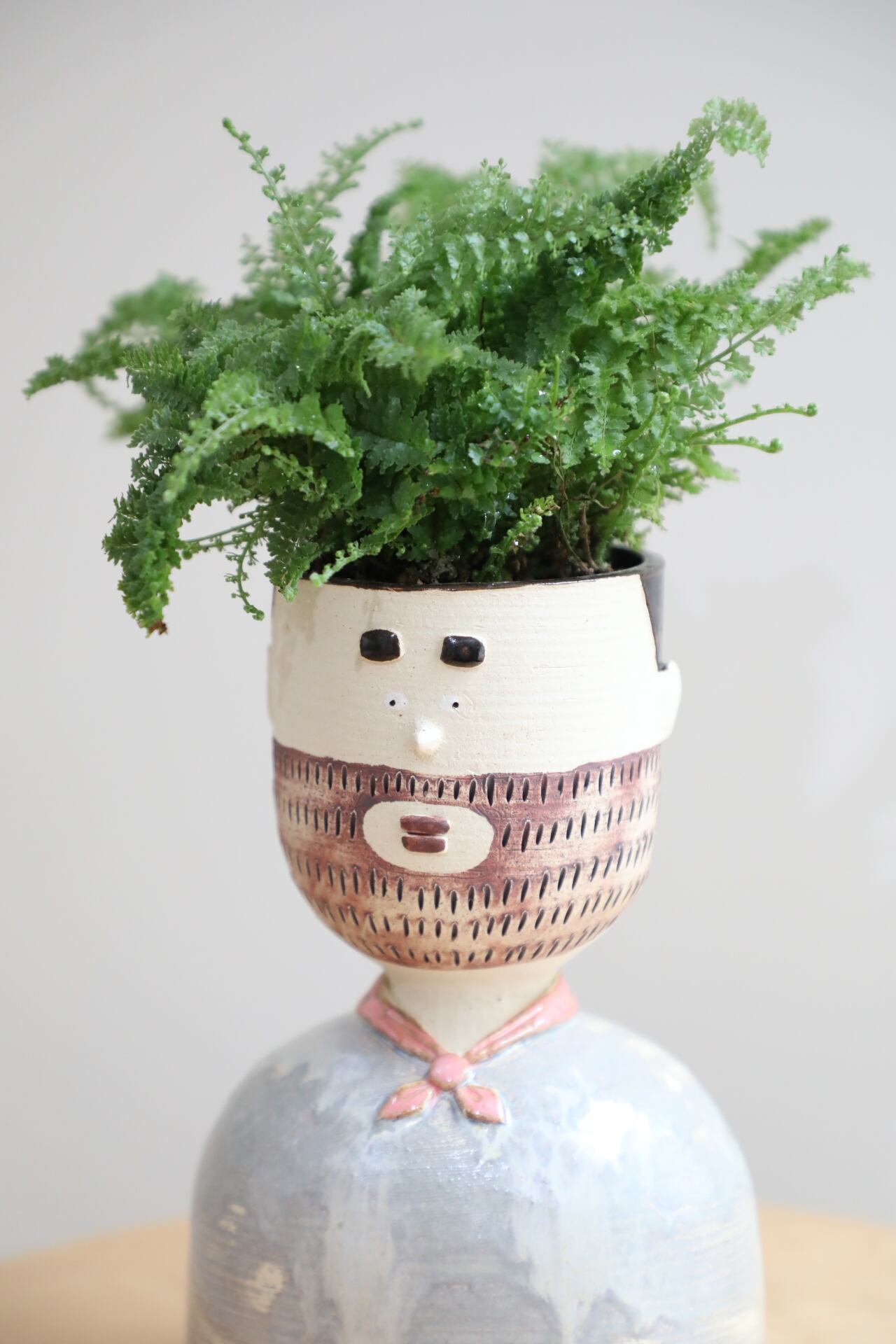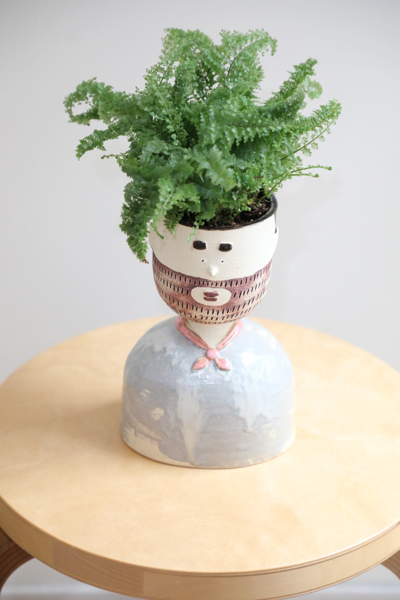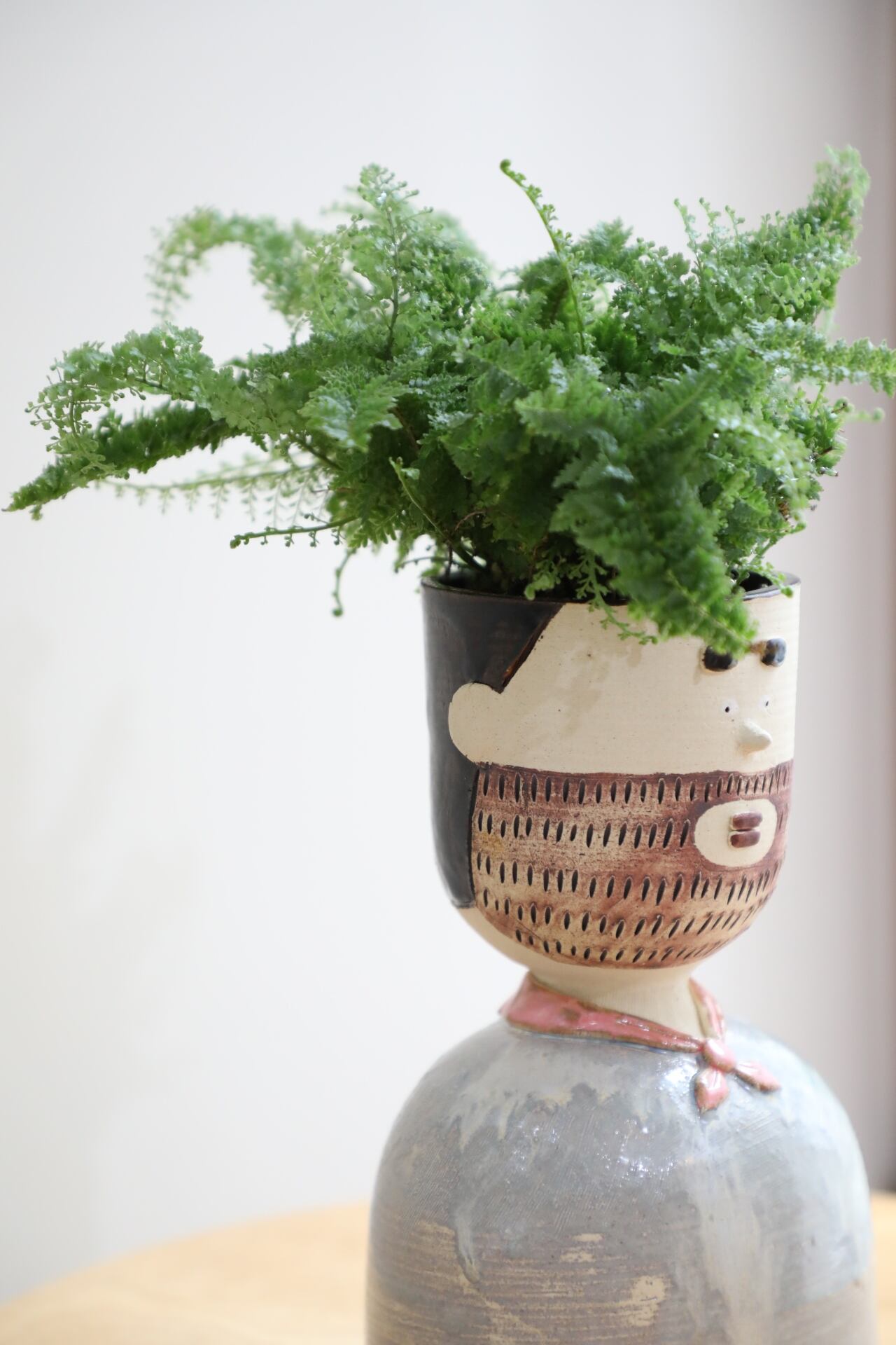 人型陶器鉢「カズオ」にスコッチシダを仕立てました。