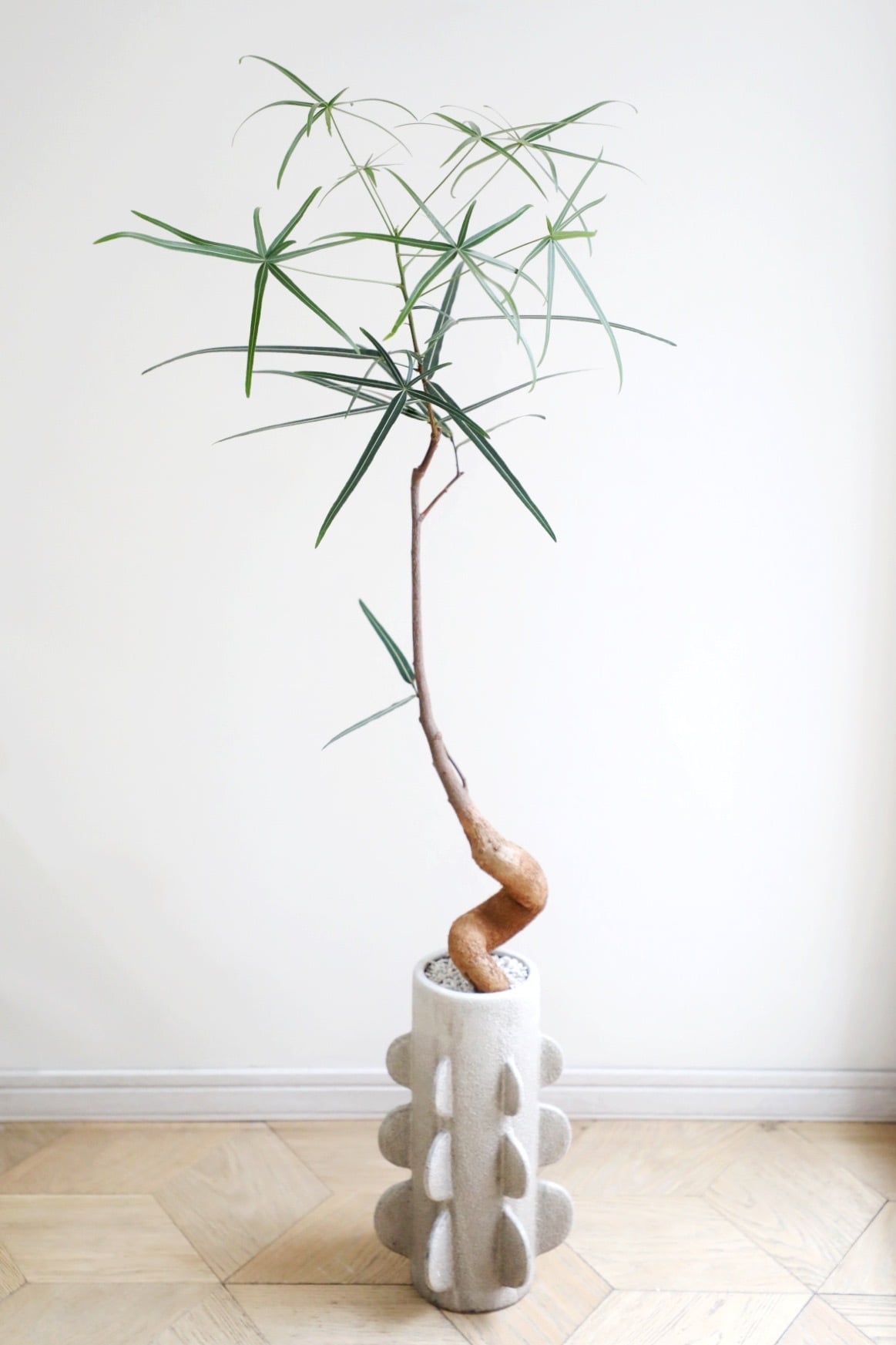 幹とは対照的に細く伸びた葉が印象的で、